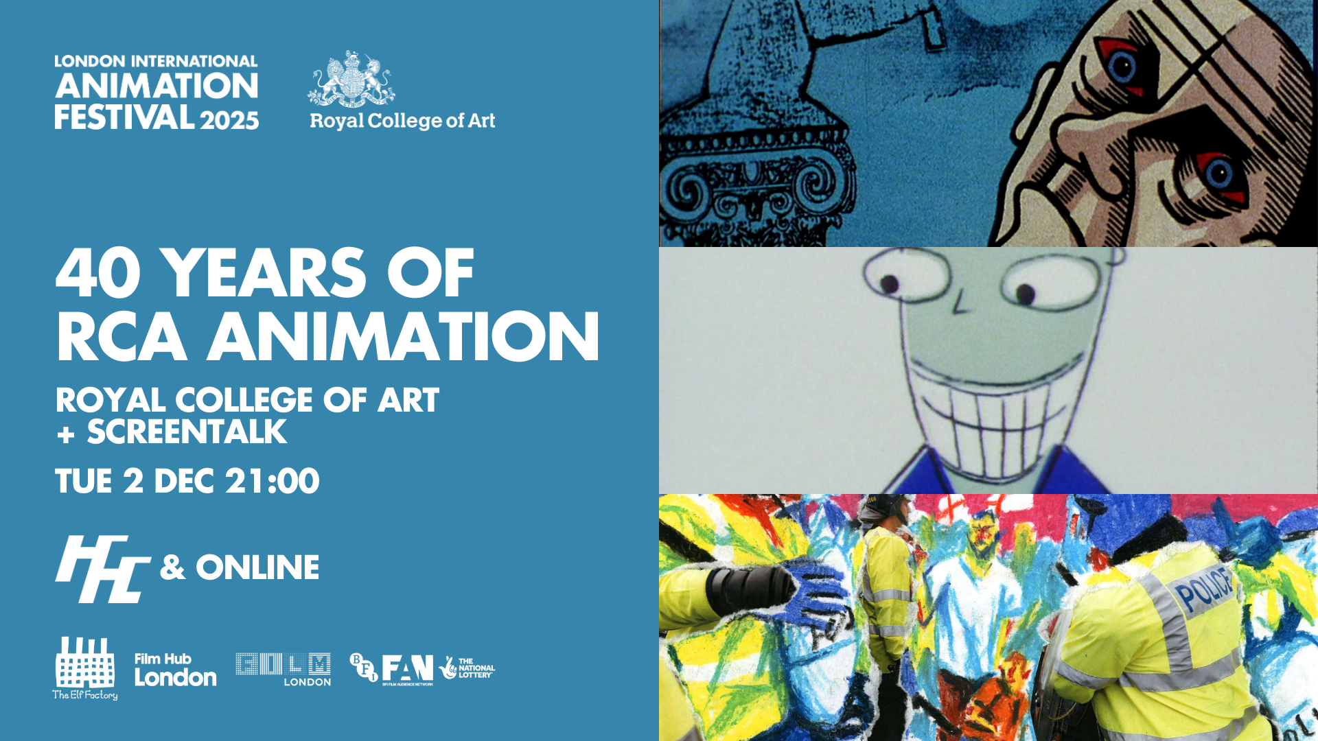 This programme has been selected by LIAF from over 1000 films in the RCA’s archive of student work, and was co-curated with Dr Carla Mackinnon (RCA tutor) and Rory Waudby-Tolley (RCA Associate Lecturer). The selection speaks to the diversity of the RCA archive, ranging from comedy and drama to documentary and innovative experiments with material and form. It includes early work by key figures in UK animation, and internationally acclaimed short films that have stood the test of time.